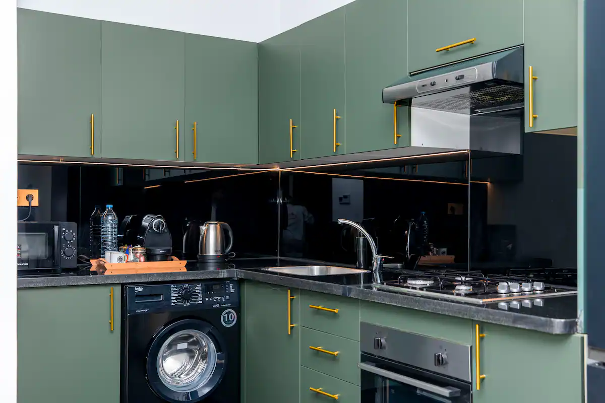Cuisine équipée : plaques, four, réfrigérateur, vaisselle et ustensiles pour cuisiner facilement.