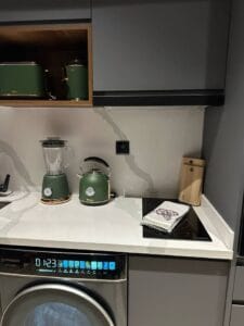 La cuisine est entièrement équipée : machine Nespresso, grille-pain, presse-agrumes, mixeur/blender, kit d’accueil, produits d’hygiène et de ménage… Tout est pensé pour vous. Fer à repasser, aspirateur, machine à laver avec sèche-linge, vaisselle complète : vous êtes chez vous, version haut de gamme.